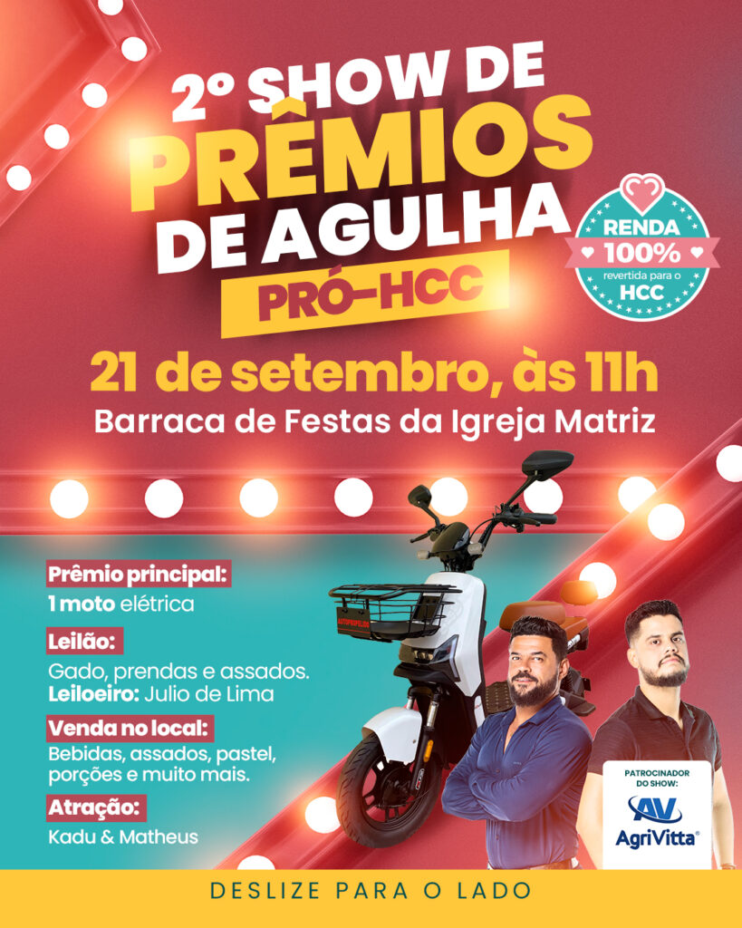 No dia 21 de setembro, a cidade de Agulha realiza o 2º Show de Prêmios em benefício do Hospital de Câncer de Catanduva (HCC) a partir das 11 horas, na barraca de festas da Igreja Matriz.