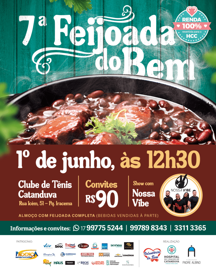 No dia 1º de junho, a partir das 12h30, acontece a 7ª Feijoada do Bem dos Voluntários do Bem, com 100% da renda revertida ao Hospital de Câncer de Catanduva (HCC). O evento acontece no Clube de Tênis Catanduva, na Rua Icém, 51 – Parque Iracema.
