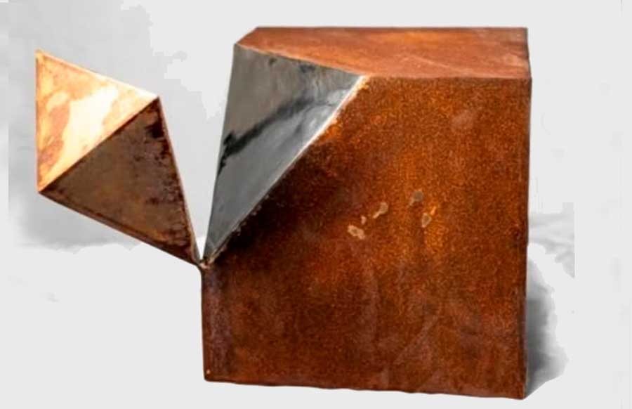 Releitura – EqPontos de equilíbrioual Richard Serra, 2021 -Luiz Breseghello, aço inox e aço corten, 35 x 35 x 35 cm, @luizbreseghello27