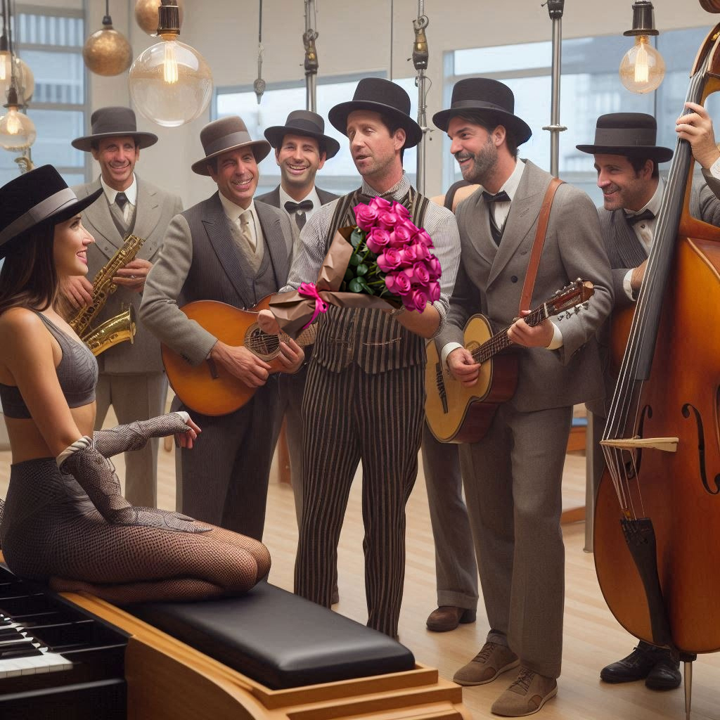 Os primeiros acordes invadiram o estúdio como um abraço inesperado. O som encheu o espaço, deslizando entre os aparelhos, pousando nos rostos atentos das alunas. Maitê virou-se devagar, e ali, diante dela, estava o grupo Serenata & Cia, trazendo música, e Edson, segurando um buquê de flores.