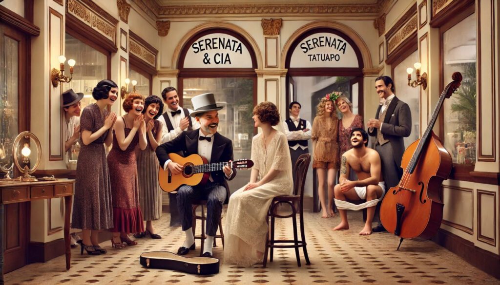 Era uma tarde especial no bairro do Tatuapé. O salão de beleza, de arquitetura encantadora, vibrava com a expectativa do casamento de Rodolfo e Adriana. Denise, irmã do noivo, resolveu surpreender sua futura cunhada enquanto ela se preparava para o grande dia. Cercada por madrinhas e amigas, Adriana se olhava no espelho quando, de repente, acordes suaves começaram a preencher o ambiente. No térreo, o grupo Serenata & Cia entoava melodias marcantes, enquanto no mezanino Adriana, emocionada, recebia a homenagem.