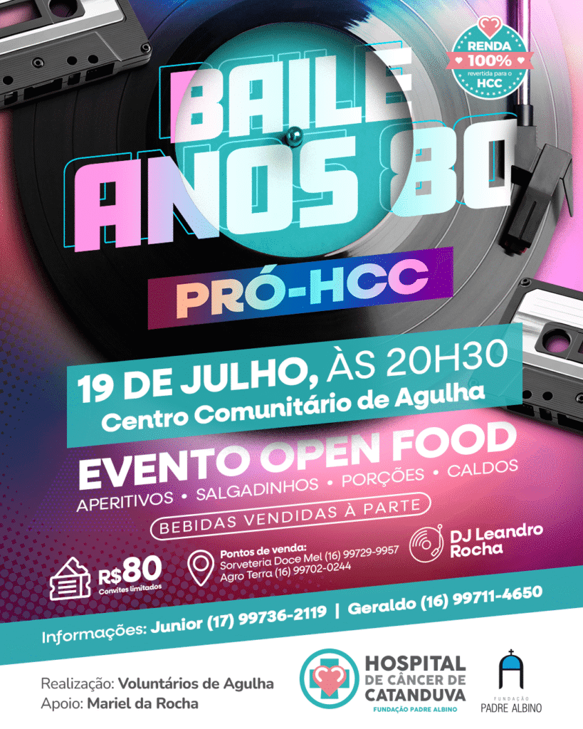 No dia 19 de julho, a partir das 20h30,  os Voluntários de Agulha, com apoio de Mariel da Rocha, realizam o Baile Anos 80 pró-HCC. O evento será realizado no Centro Comunitário de Agulha e promete noite animada, solidária e cheia de nostalgia, com open food de aperitivos, salgadinhos, porções e caldos. As bebidas serão vendidas separadamente. Quem comandará a pista é o DJ Leandro Rocha, garantindo hits dos anos 80 para ninguém ficar parado!