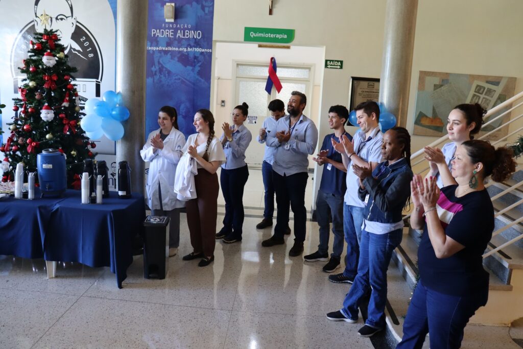 A Fundação Padre Albino realizou na manhã desta quarta-feira, 16 de novembro, evento de encerramento das atividades do Novembro Azul promovidas pelo projeto Blitz da Saúde, iniciativa do GAT – Grupo de Apoio ao Trabalhador. A celebração ofereceu café da manhã especial aos colaboradores marcando o fechamento do mês dedicado à prevenção e à conscientização sobre o câncer de próstata.