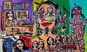 Nascida e moradora de Presidente Prudente, SP (1978), Juliana Scorza, em “Inconsciente Coletivo”, pintada com tinta acrílica sobre tela (50 x 80 cm), leva a