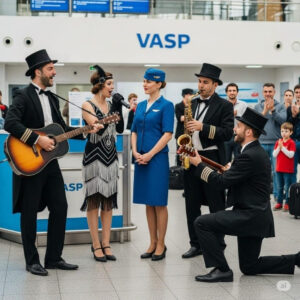 Bárbara era atendente da Vasp, conhecida pelo sorriso doce que acalmava passageiros nervosos. Chegamos cedo com nosso trio: eu no violão e voz, a cantora e o saxofonista pronto para encantar o aeroporto inteiro. Afinal, se era pra pedir em casamento, que fosse inesquecível.