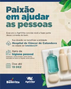 A AgriVitta iniciou a campanha solidária “Paixão em ajudar as pessoas”, mobilizando colaboradores, parceiros e a comunidade para arrecadar itens de higiene pessoal destinados aos pacientes do Hospital de