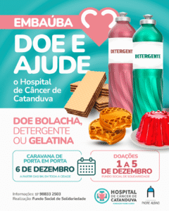 O Fundo Social de Solidariedade de Embaúba está promovendo campanha de arrecadação de bolacha, detergente e gelatina, com o objetivo de apoiar o Hospital de Câncer de Catanduva (HCC).