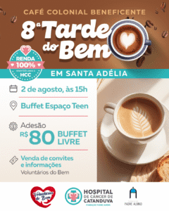 No dia 2 de agosto, a partir das 15h, acontece a 8ª Tarde do Bem em Santa Adélia em prol do Hospital de Câncer de Catanduva (HCC). Organizada pelos Voluntários