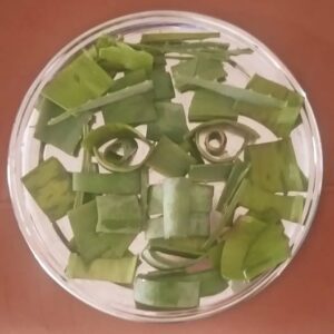 Renascimento verde, 2025 – Marilda Albinocasca de babosa e prato de vidro Tomar a natureza como ponto de partida de um trabalho demanda um olhar