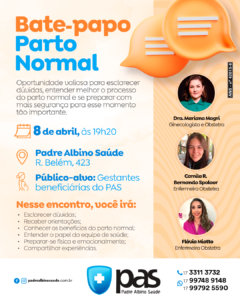 O Padre Albino Saúde (PAS) realiza, no dia 8 de abril, às 19h20, o Bate-papo sobre Parto Normal voltado para gestantes beneficiárias do plano que desejam esclarecer