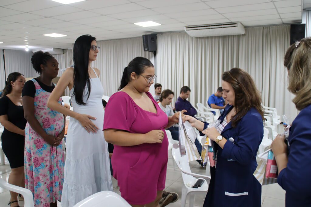 No encerramento, as mamães receberam mimos oferecidos por apoiadores do curso, reforçando o carinho e a atenção voltados às futuras famílias.