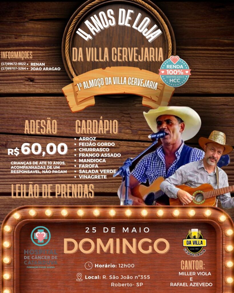 A Da Villa Cervejaria, de Vila Roberto, completa 4 anos e para comemorar realizará o 1º Almoço Da Villa Cervejaria com 100% da renda revertida para o Hospital de Câncer de Catanduva (HCC) no dia 25 de maio, às 12h.