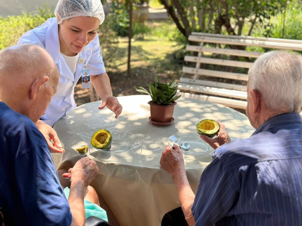 Acompanhados pela equipe multidisciplinar, os idosos participaram ativamente da colheita na última sexta-feira (7 de fevereiro), selecionando e colhendo os frutos diretamente do pé. Após a atividade, os abacates foram consumidos com a orientação da nutricionista Mayara de Oliveira, que destacou os benefícios dessa fruta para a saúde, especialmente na terceira idade. “O abacate é excelente fonte de gorduras saudáveis, fundamentais para a saúde cardiovascular e cerebral. Além disso, possui propriedades anti-inflamatórias e é rico em fibras, auxiliando na digestão e no controle glicêmico. Incorporar essa fruta na alimentação na terceira idade pode contribuir para melhorar a qualidade de vida”, explicou Mayara.