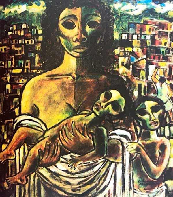 “Dois filhos” traz a temática social com força. As feições remetem a caveiras e esqueletos dentro de uma perspectiva social ressaltada pelo fundo da tela, com a visão de uma comunidade aparentemente caótica. A obra pode ser colocada no contexto das obras do artista em diálogo com o expressionismo alemão, mas numa atmosfera brasileira como o cotidiano das favelas.