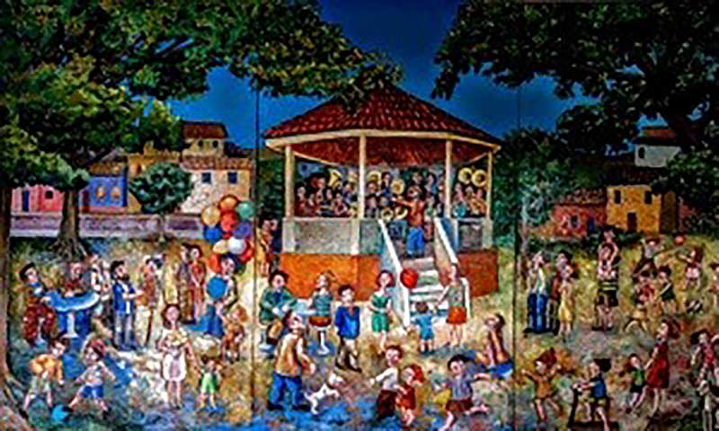 Realizado com técnica mista, o tríptico “El Quiosco” (2,50 x 4,50 m), de Enrique Aravena (@enrique.octavio.aravena), torna-se uma metáfora da humanidade. O tema é uma praça com um coreto (“quiosco”, como se diz no México), uma banda tocando e pessoas do povoado no entorno.
