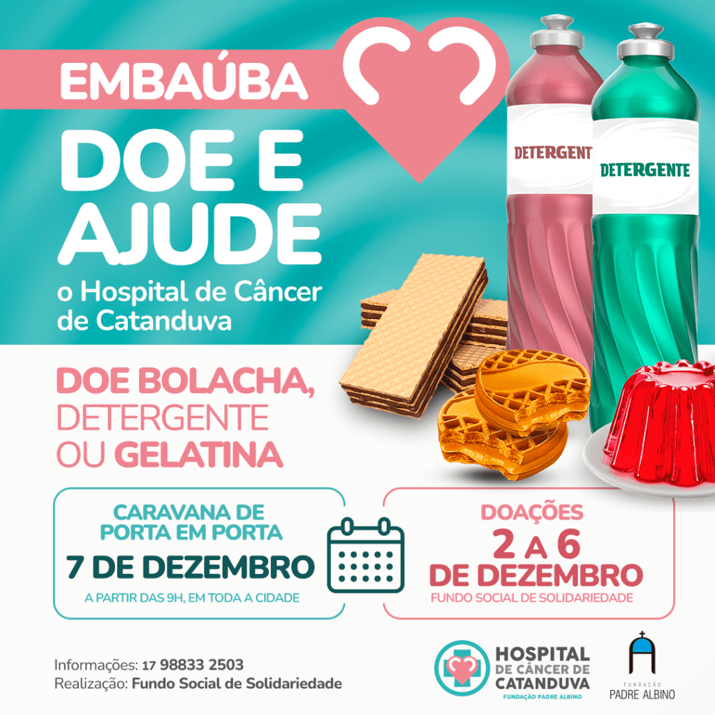 A cidade de Embaúba está mobilizada na campanha “Doe e Ajude”, ação solidária em prol do Hospital de Câncer de Catanduva. A campanha tem como objetivo arrecadar bolacha, detergente e gelatina, itens utilizados na alimentação e higiene.