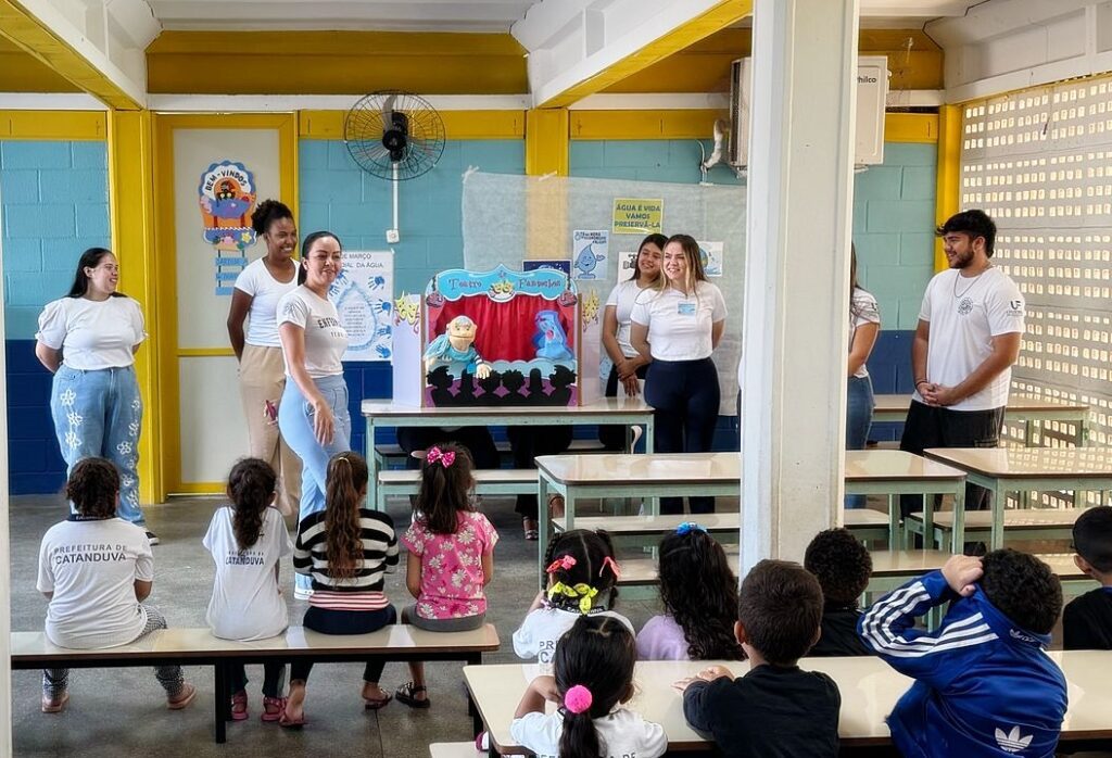 A atividade foi supervisionada pelo Prof. Rodrigo Neves e dividida em dois momentos. Pela manhã, os alunos trabalharam o tema “A Importância da Água” por meio de teatro de fantoches, seguido de interação com o grupo. Para reforçar o aprendizado, cantaram música autoral sobre economia de água, acompanhada de coreografia, tornando o aprendizado mais dinâmico.