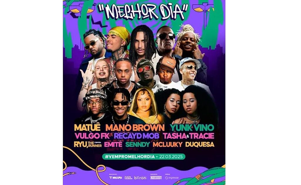 📅 Data: 22 de março 📍 Local: Neo Química Arena 🎤 Line-up: Matuê, Mano Brow, Vulgo FK, Mc Luuky, Ryu The Runner, Emitê, Senndy, Duquesa, Yunk Vino, Recayd Mob, Tasha & Tracie, entre outros.