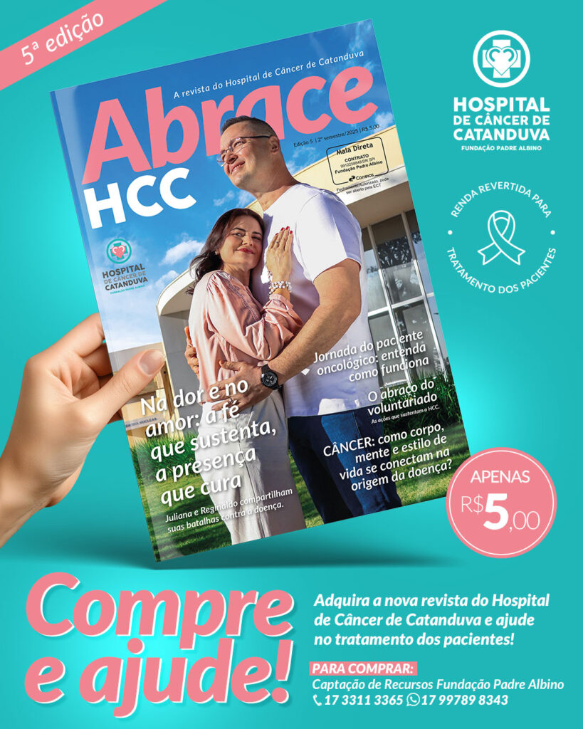 Hospital de Câncer de Catanduva (HCC) acaba de lançar a 5ª edição da revista Abrace HCC, publicação anual que traz histórias de vida, coragem e esperança. Nesta edição especial, os protagonistas são os próprios pacientes que ilustram a campanha de 6 anos do hospital. Cada relato revela como o diagnóstico mudou suas vidas, como enfrentaram o tratamento e, principalmente, como encontraram força para seguir adiante.