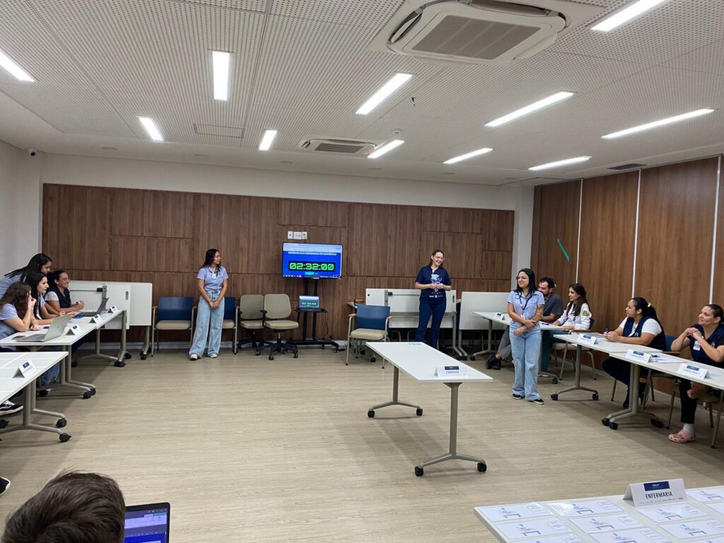 No primeiro dia de alinhamento uma dinâmica lúdica envolveu colaboradores de diferentes setores, tanto assistenciais quanto administrativos, simulando plantão de 24 horas. A atividade foi dividida em duas etapas: na primeira, sem critérios definidos, foi possível observar o fluxo espontâneo de trabalho; na segunda, com critérios estruturados e planos de ação estabelecidos, evidenciando, na prática, os ganhos obtidos com as melhorias implementadas. As consultoras também acompanharam a realização dos Huddles, reuniões rápidas de alinhamento, com o objetivo de identificar oportunidades de aprimoramento. A programação incluiu ainda aula sobre gestão de leitos hospitalares, reforçando conceitos importantes para a organização dos fluxos assistenciais.