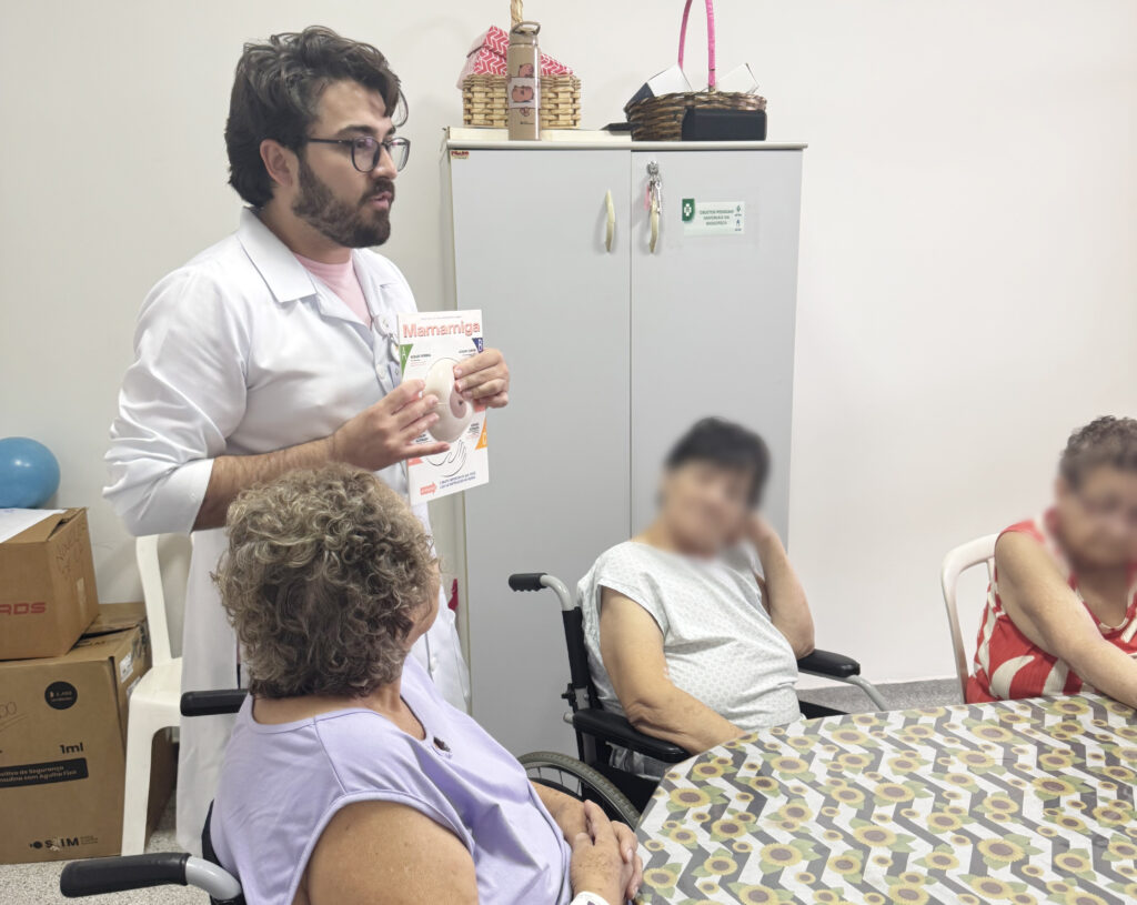 Já no HEC a ação “Toque de Esperança” também reuniu pacientes e acompanhantes para conversa sobre o Outubro Rosa, conduzida pelo Serviço de Psicologia, que ensinou a forma correta do autoexame com apoio da “Mama Amiga” enquanto a equipe de Nutrição reforçava orientações de saúde estimulando a troca de experiências em roda de conversa. O encontro terminou com a divertida dinâmica “Bola Queimada”, organizada pelo Serviço de Fisioterapia, promovendo movimento e descontração.