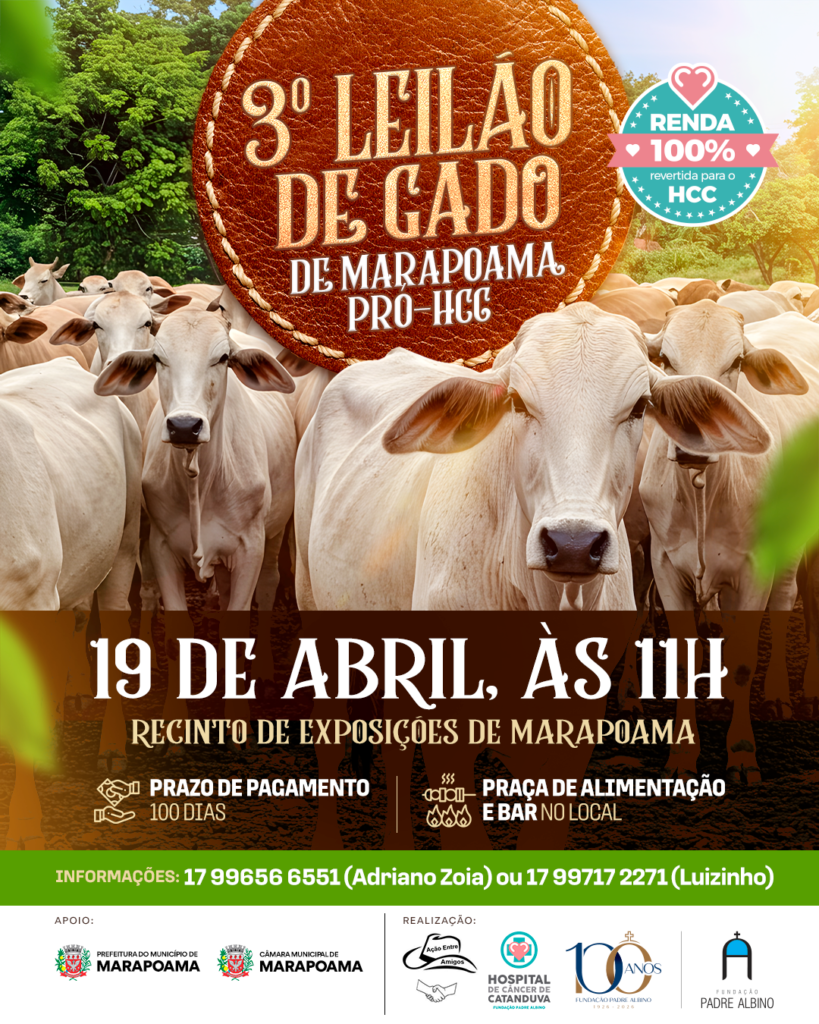 O Grupo Ação Entre Amigos promove no dia 19 de abril, a partir das 11 horas, no recinto de exposições, o 3º Leilão de Gado de Marapoama, evento que destinará 100% da renda ao Hospital de Câncer de Catanduva (HCC).