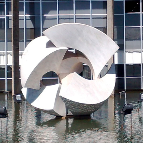 Escultura de Bruno Giorgi, produzida com mármore branco de Carrara, “Meteoro” está localizada sobre o espelho d’água em frente ao Palácio Itamaraty, em Brasília, DF. A obra, esculpida entre 1967 e 1968, é montada com cinco partes de uma esfera vazada estilizada, simbolizando os laços diplomáticos entre os cinco continentes.