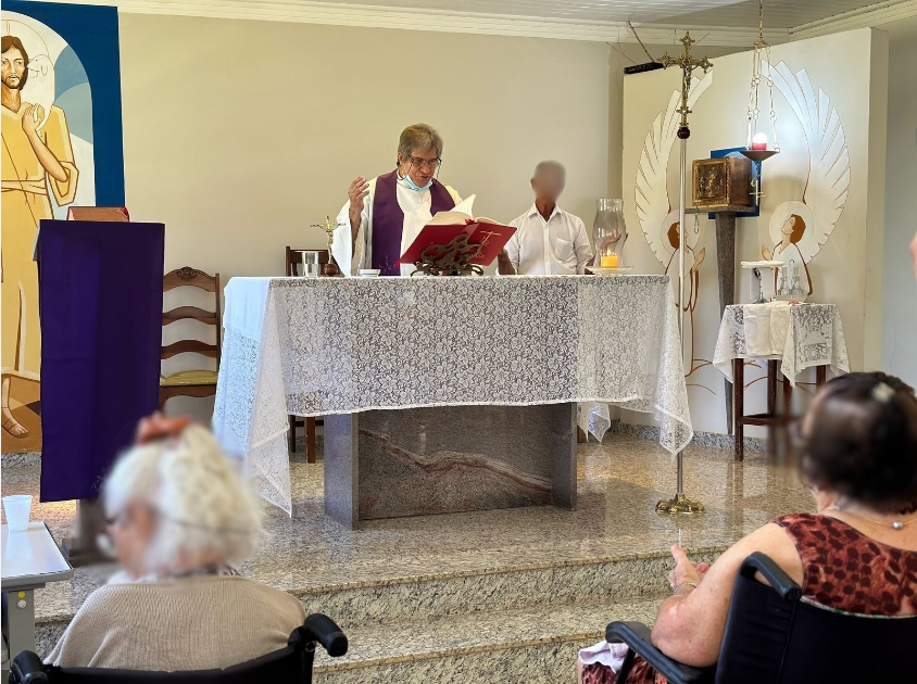 Demonstrando atenção especial às pessoas idosas institucionalizadas que não puderam comparecer à capela, o padre levou o vaso com as cinzas até elas, permitindo que todos recebessem a imposição e participassem desse momento de fé e espiritualidade.
