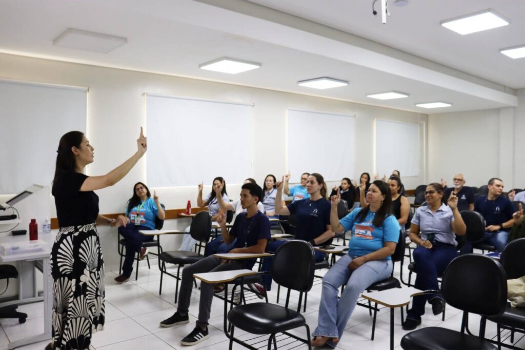 Nesta primeira aula, a professora apresentou aos participantes o alfabeto em LIBRAS e orientou sobre as formas iniciais de comunicação na língua de sinais. As atividades incluem conteúdos introdutórios que permitem aos colaboradores conhecer os fundamentos da comunicação com pessoas surdas.