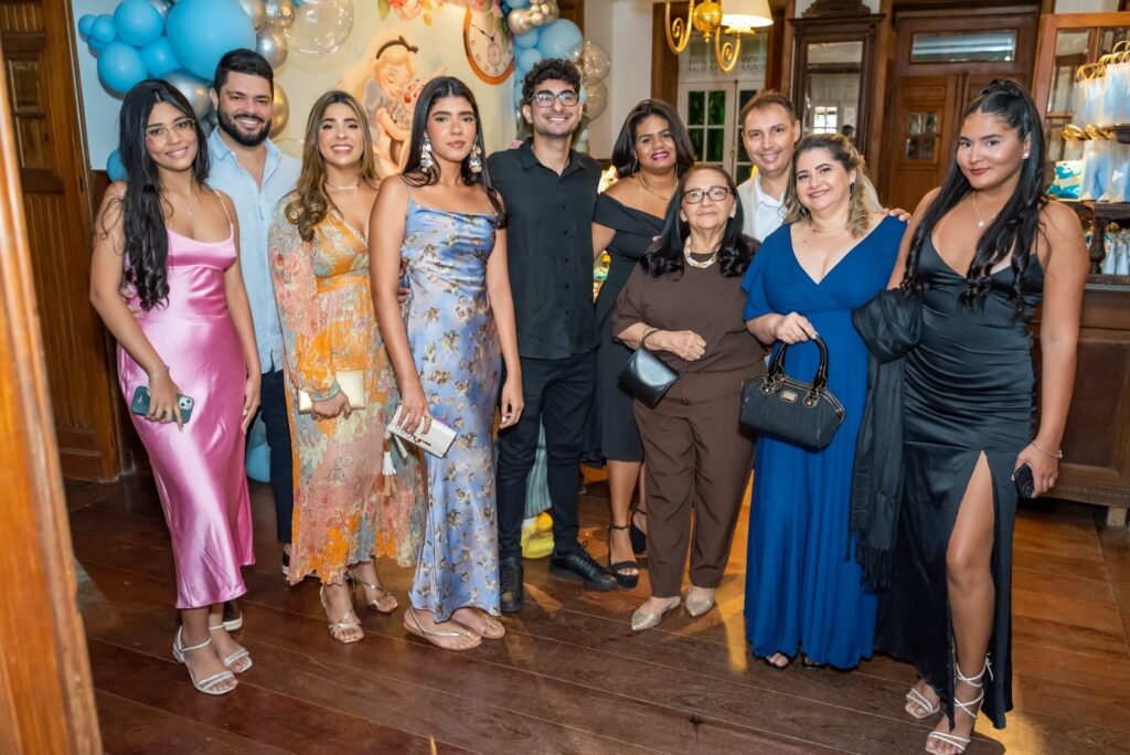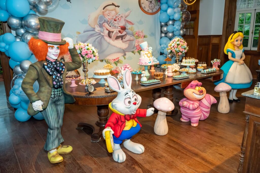 Decoração. Com a produção de Marcela Lemos, “Impecável” é a palavra que define. Com esculturas e personagens da história em tamanho real, com flores nas cores rosa e azul, encantou a todos.