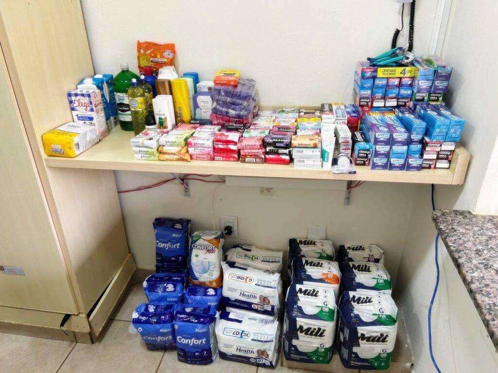 Durante a visita, os participantes conversaram com as pessoas idosas e entregaram expressiva doação de produtos de higiene e fraldas geriátricas. Ao todo, foram arrecadados 284 itens, entre cremes dentais, sabonetes, fraldas, shampoos, condicionadores e outros produtos essenciais ao cuidado diário dos moradores.