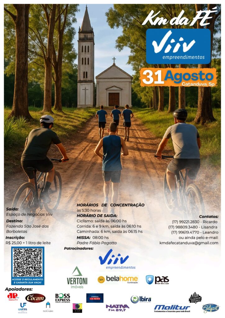 Caminhada, corrida e ciclismo são o misto de atividades da ação Km da Fé Catanduva que reunirá participantes no dia 31 de agosto, às 5h30 da manhã, no Espaço de Negócios Viiv. O encontro promove a prática de atividades físicas e a fé, num percurso emocionante até a Capela na Fazenda São José das Borboletas para café da manhã e missa com Padre Fábio Pagotto, às 8 horas.