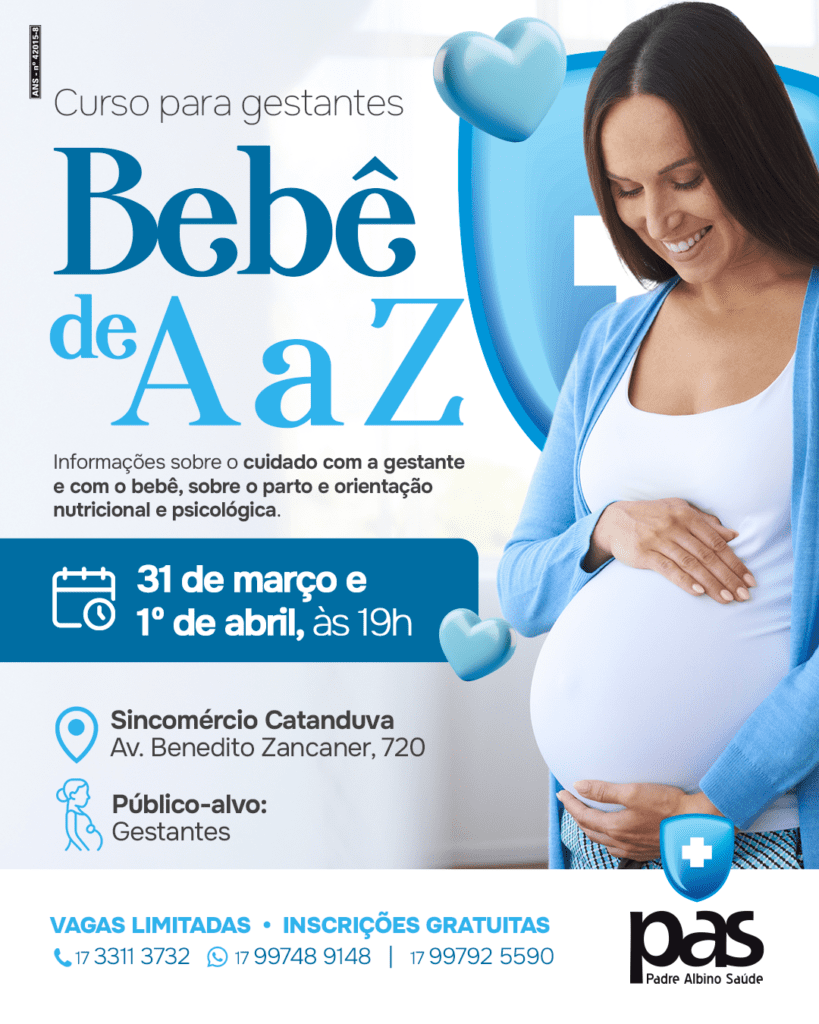 O Padre Albino Saúde (PAS) promove mais uma edição do curso de gestantes Bebê de A a Z nos dias 31 de março e 1º de abril, às 19h, no Sincomércio Catanduva, localizado na Avenida Benedito Zancaner, 720.