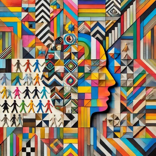Dois rostos estilizados, um a olhar para cada lado, são cercados de geometrias e de figuras humanas de mãos dadas a indiciar as possibilidades de um todo harmônico. de cores e formas.
