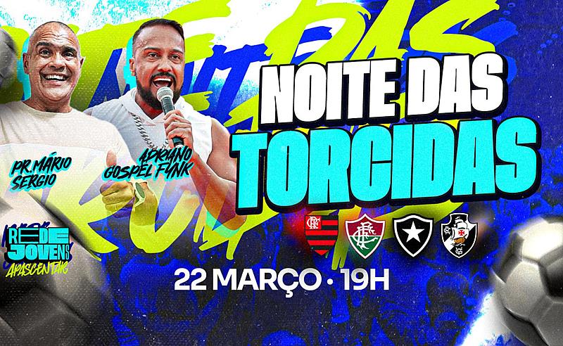 Os apaixonados pelo futebol têm um encontro marcado neste sábado (22), a partir das 19h, mas não é no Maracanã, mas na igreja. Pois é, a rede de jovens do Ministério Apascentar de Nova Iguaçu promove a primeira edição da Noite das Torcidas, que promete ser uma noite de louvor e adoração com todo mundo usando a camisa do seu time do coração.