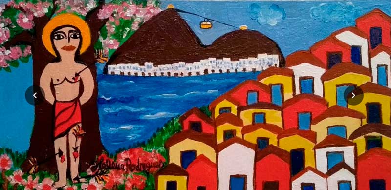 A obra “Proteção de São Sebastião”, de Helena Rodrigues, apresenta três elementos essenciais: São Sebastião, a cidade do Rio de Janeiro e as comunidades. A cidade surge vazia: não há pessoas ou barcos. Mas o Santo, padroeiro local, está ali para que todos se sintam protegidos.