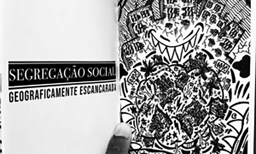 A arte pode ter muitos gatilhos motivadores. Um deles é a indignação com a desigualdade social. A partir desse disparo, R. Trompaz (@rtrompaz) realiza a série de trabalhos que integram seu Trabalho de Conclusão de Curso em Design Gráfico no Centro Universitário Belas Artes em São Paulo, SP. Intitulado SSGE (Segregação Social Geograficamente Escancarada), o conjunto, em que se destacam os desenhos feitos com caneta com ponta de feltro sobre papel, apresenta uma identidade visual plena de simbolismos, como as comunidades muitas vezes submersas, as moradias sub-humanas, os céus tempestuosos, com nuvens pesadas e trovões, a aglomeração de imagens e os traços espessos indicando o peso de vidas muitas vezes sem alternativas futuras.