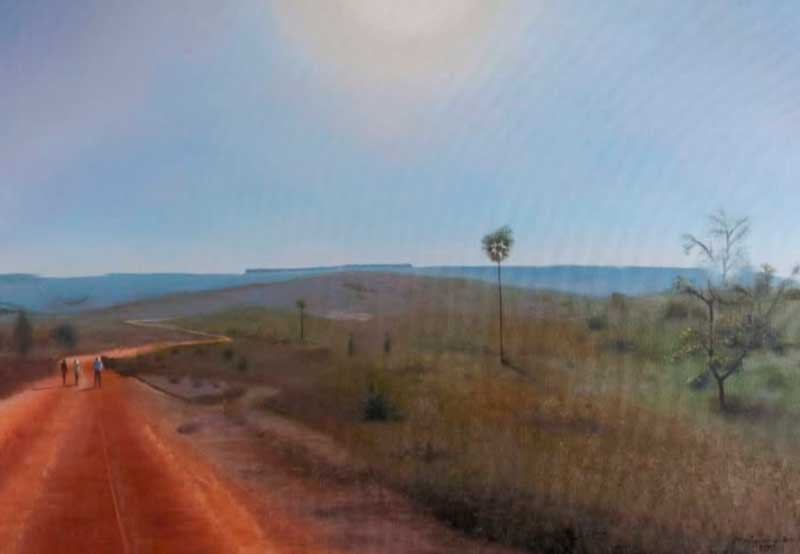 Baseado nessa jornada do escritor mineiro, o pintor Monteiro de Barros fez a tela “Sertão de Guimarães Rosa”, expressando as cores e tonalidades da luminosidade da região, com seu solo árido e vegetação marcada pelos buritis, com o sol onipresente transformando os verdes eucaliptos em um grupo azulado a dialogar com o céu.