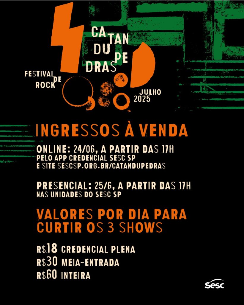 Nesta terça-feira, dia 24, às 17h, o Sesc Catanduva abre as vendas online de ingressos para a 13ª edição do Catandupedras — festival de rock, que acontece de 10 a 13 de julho e promete agitar a cidade com grandes nomes do rock. As vendas presenciais terão início no dia seguinte, 25 de junho, também às 17h, na Central de Atendimento. Os ingressos custam a partir de R$18,00 e a classificação indicativa é de 16 anos.
