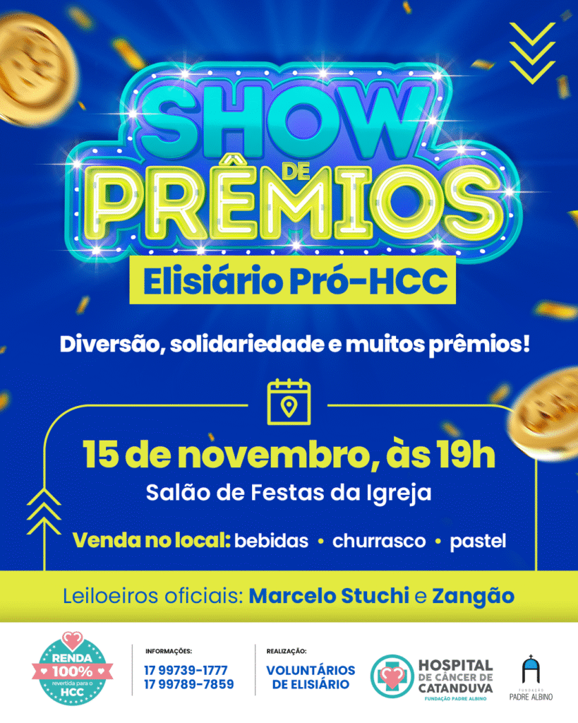 No dia 15 de novembro, Elisiário se une mais uma vez em solidariedade ao Hospital de Câncer de Catanduva (HCC)com a realização de Show de Prêmios. O evento acontece a partir das19 horas, no Salão de Festas da Paróquia Imaculada Conceição, e promete uma noite animada, com diversão, solidariedade e prêmios para todos os gostos.