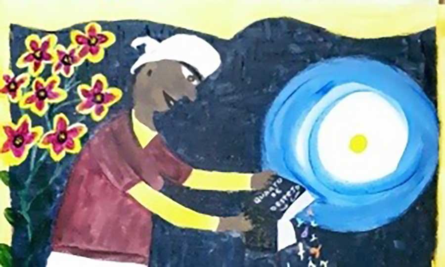 Nascido em Santa Rita de Caldas, MG, e residente em Mirassol, SP, Jair Lemos (1955), em “Tributo a Carolina de Jesus”, obra pintada com tinta acrílica sobre tela (50 x 40 x 1,5 cm), homenageia a escritora (Sacramento, 1914 – São Paulo, SP, 1977), que se celebrizou pelo livro “Quarto de Despejo: Diário de uma Favelada”, publicado em 1958. Ela foi uma das primeiras escritoras negras do Brasil e viveu boa parte de sua vida na favela paulistana do Canindé, sustentando a si e aos três filhos, que aparecem na tela, como catadora de papéis. Com o auxílio do jornalista Audálio Dantas, a obra teve ampla divulgação e foi traduzido em diversos idiomas. O quadro aponta para força dessa mulher, que, com suas letras, ancestralidade e situação social, ganhou espaço na literatura e na cultura nacional. Esta obra foi selecionada para participar do Salão Paulista de Arte Naif 2021, no Museu de Arte Sacra de São Paulo, SP.