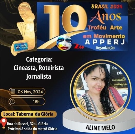 No dia 6 de novembro de 2024 haverá a 10° Edição do “Troféu Arte em Movimento“, que premiará vários artistas brasileiros e internacionais, entre esses artista está a cineasta, Roteirista e jornalista brasileira Aline Melo. O evento será às 18h, no Rio de Janeiro, na Glória. A premiação estará com organização da comissão do poeta e escritor Jorge Ventura.