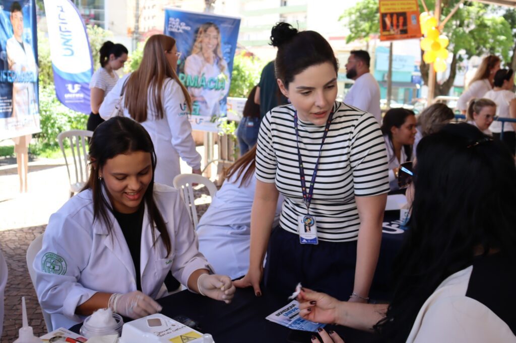 Alunos dos cursos de graduação da UNIFIPA promoveram atividades e oficinas. O curso de Biomedicina realizou testagem de glicemia, enquanto estudantes de Enfermagem ofereceram orientações sobre o câncer de mama utilizando a prótese didática “Mama Amiga”, que auxilia na identificação de possíveis nódulos. O curso de Farmácia ministrou oficina para confecção de sais de banho e a equipe de Psicologia conduziu workshop sobre a ‘Síndrome de Burnout e a mulher do século XXI’. Já os alunos de Pedagogia organizaram duas atividades voltadas ao bem-estar feminino: ‘De bem com a vida: cultivando a autoestima e o empoderamento’ e a oficina ‘Eu me amo’.