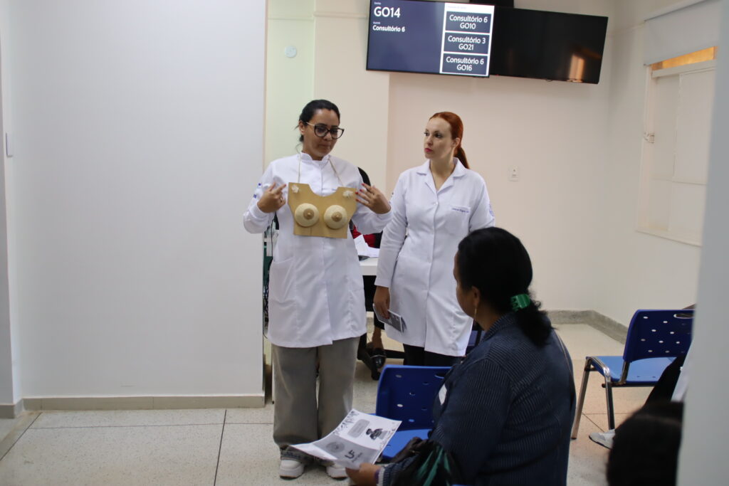 No dia 22 de outubro, alunas do 1º ano de Enfermagem da UNIFIPA realizaram ação educativa no Ambulatório de Ginecologia e Mastologia do Hospital Emílio Carlos (HEC) e do Hospital de Câncer de Catanduva (HCC). A iniciativa teve como objetivo orientar as mulheres que aguardavam atendimento sobre a importância do autoexame, da prevenção ao câncer de mama e colo de útero e do diagnóstico precoce. Durante a ação, as estudantes explicaram como identificar alterações no corpo e a importância de procurar atendimento médico diante de qualquer sinal suspeito.