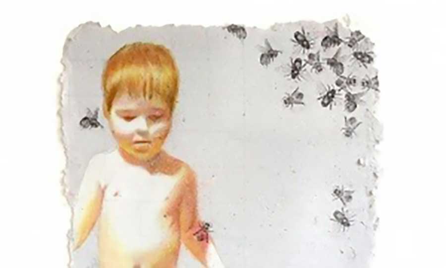 A imagem traz uma criança cercada por “Honey bee drone”, ou seja, zangões, que são os machos de diversas espécies de abelhas sociais. Maiores que as obreiras, não tem ferrão para defender a colmeia ou órgãos que permitam produzir mel. A sua única função é a de reprodução.